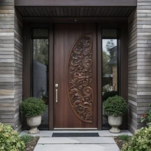 - A teak wood door with carving showcases intricate designs expertly hand-carved into the solid teak surface, highlighting the wood’s natural grain and rich golden-brown color. These carvings often feature traditional motifs, floral patterns, or custom artwork, adding a touch of elegance and artistry to the door. The strength and smooth texture of teak make it ideal for detailed carving, ensuring…
