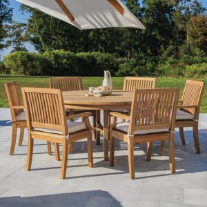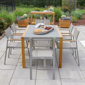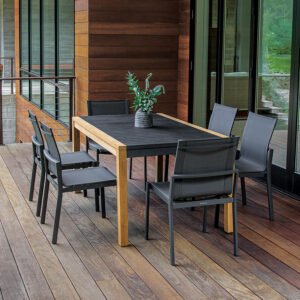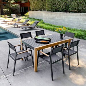- Outdoor Dinning Set Enjoy al fresco meals with this stylish outdoor dining set, featuring a durable teak wood table and matching chairs. Designed to withstand the elements, the set combines natural beauty with comfort, making it perfect for patios, gardens, or balconies. Its timeless design complements any outdoor space, offering a welcoming spot for gatherings and relaxation.