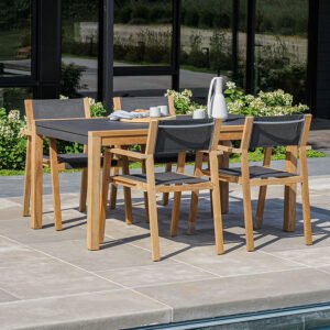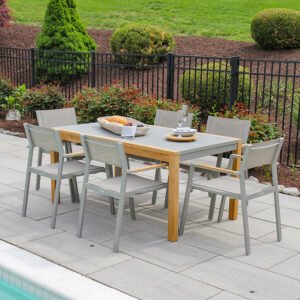 - Enjoy al fresco meals with this stylish outdoor dining set, featuring a durable teak wood table and matching chairs. Designed to withstand the elements, the set combines natural beauty with comfort, making it perfect for patios, gardens, or balconies. Its timeless design complements any outdoor space, offering a welcoming spot for gatherings and relaxation.