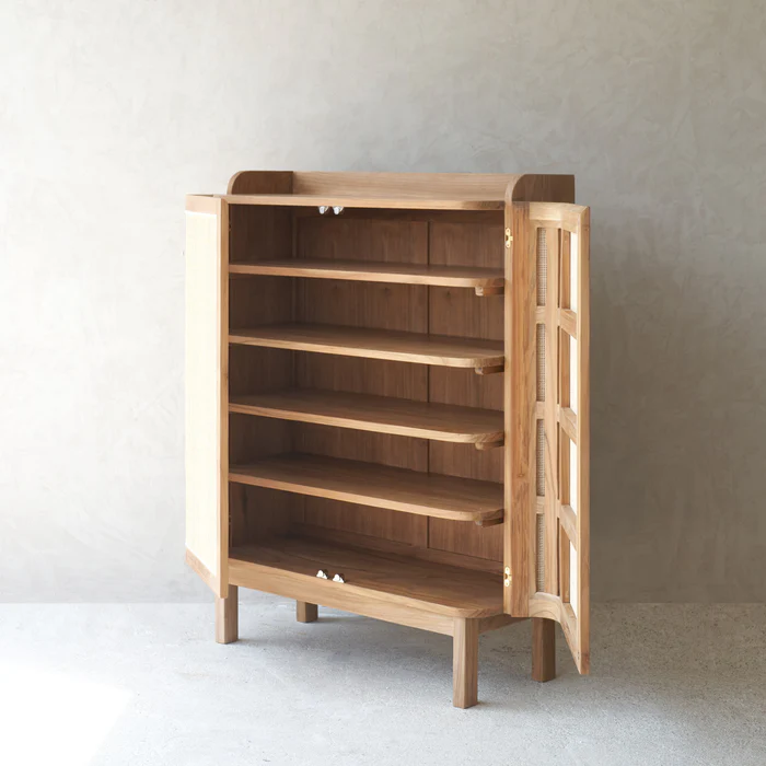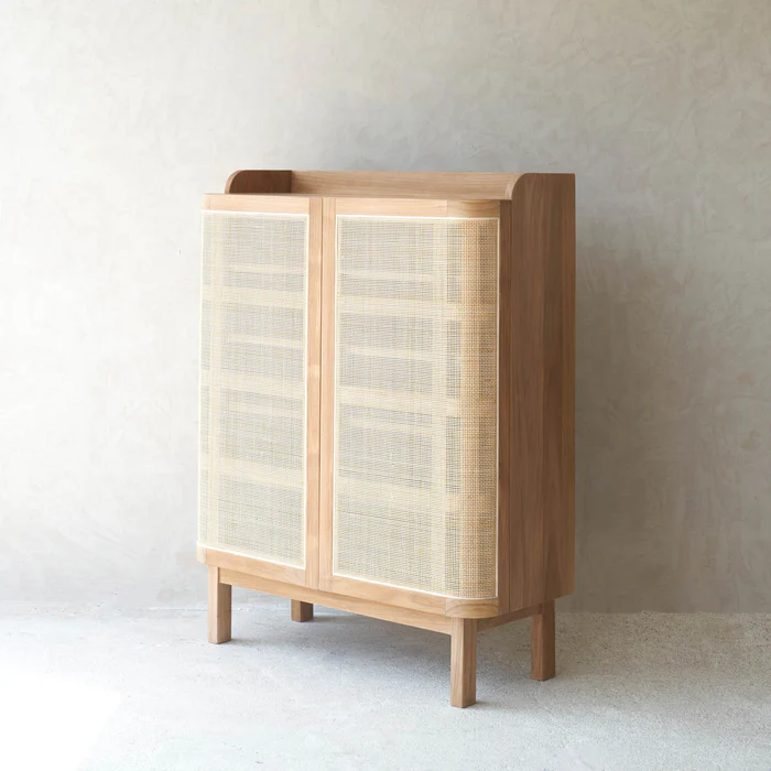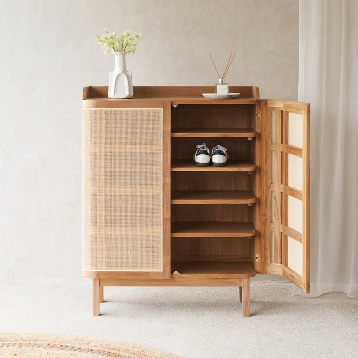 Enhance your home with this teak rattan shoe cabinet, combining sturdy teak wood and stylish woven rattan. Perfect for shoe storage in entryways or bedrooms, it offers ample space, natural ventilation, and a unique, elegant look. Durable and easy to maintain, this cabinet keeps your footwear organized while adding a touch of sophistication to your décor.
